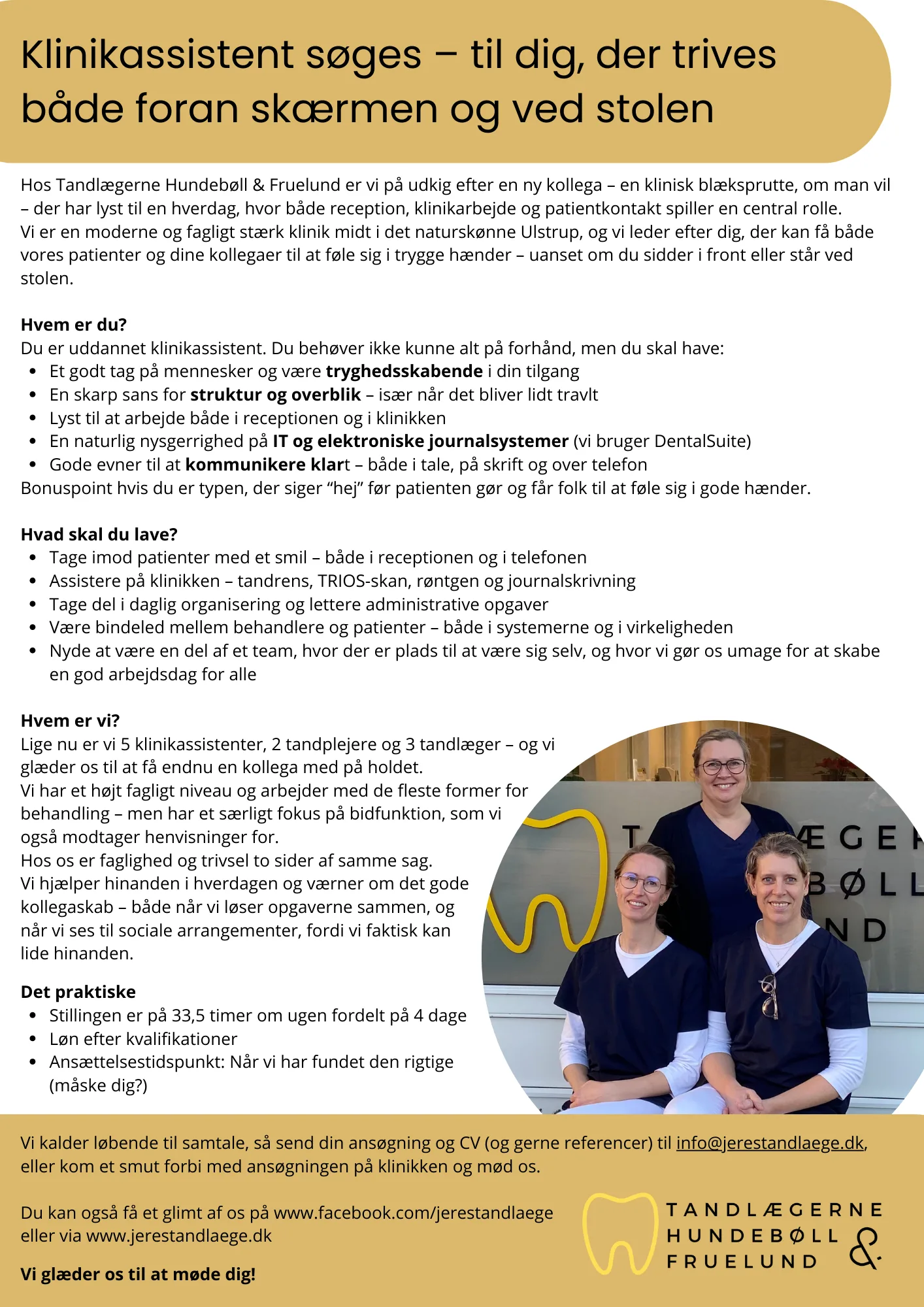 Lige nu er vi 5 klinikassistenter, 2 tandplejere og 3 tandlæger – og vi glæder os til at få endnu en kollega med på holdet.